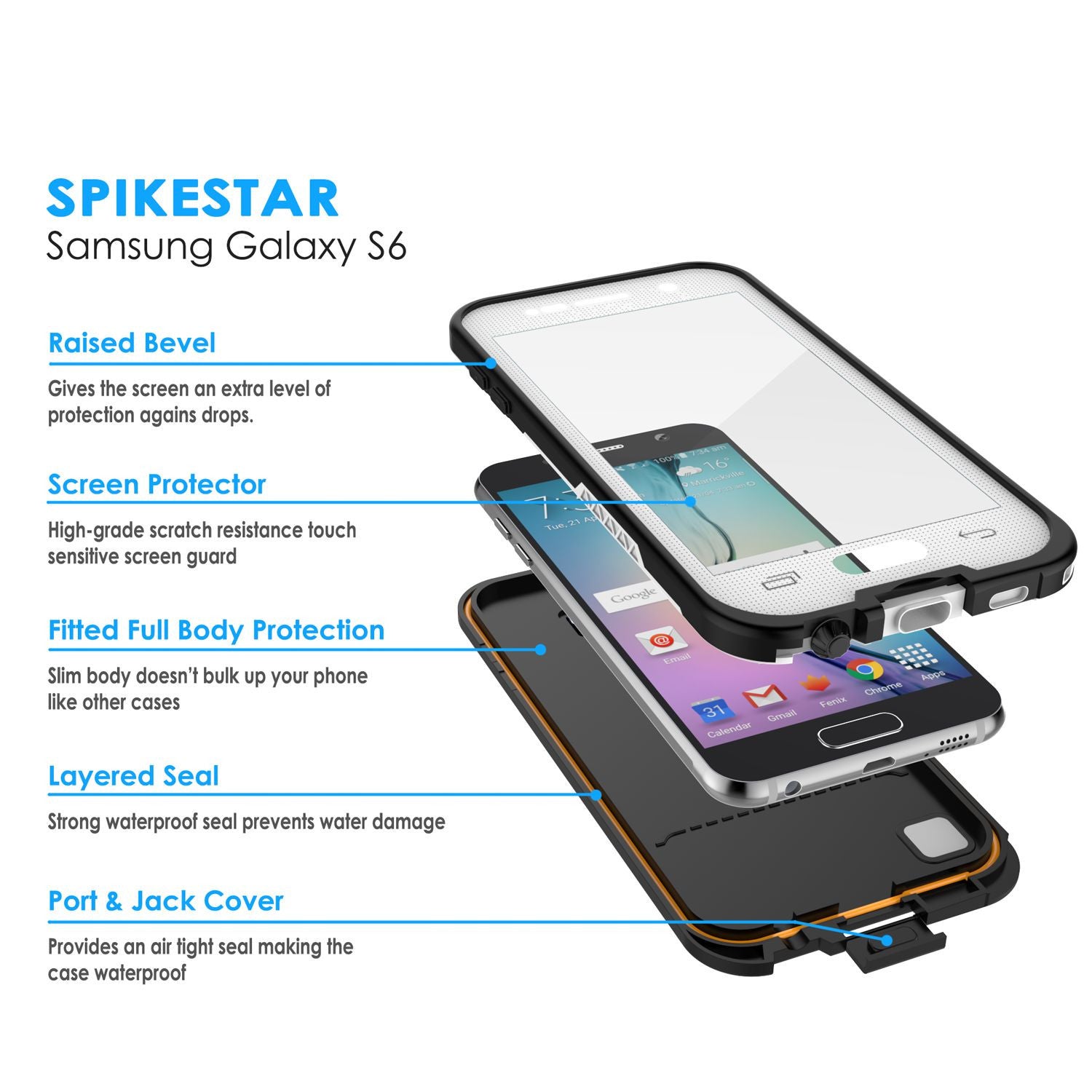 El estuche SpikeStar ha sido probado hasta 6.6 pies de profundidad y 10 minutos en el agua. Resistente al agua, al polvo, a la nieve, al barro y a los golpes, y tiene un protector de pantalla HD claro y resistente a los arañazos para completar la protección.