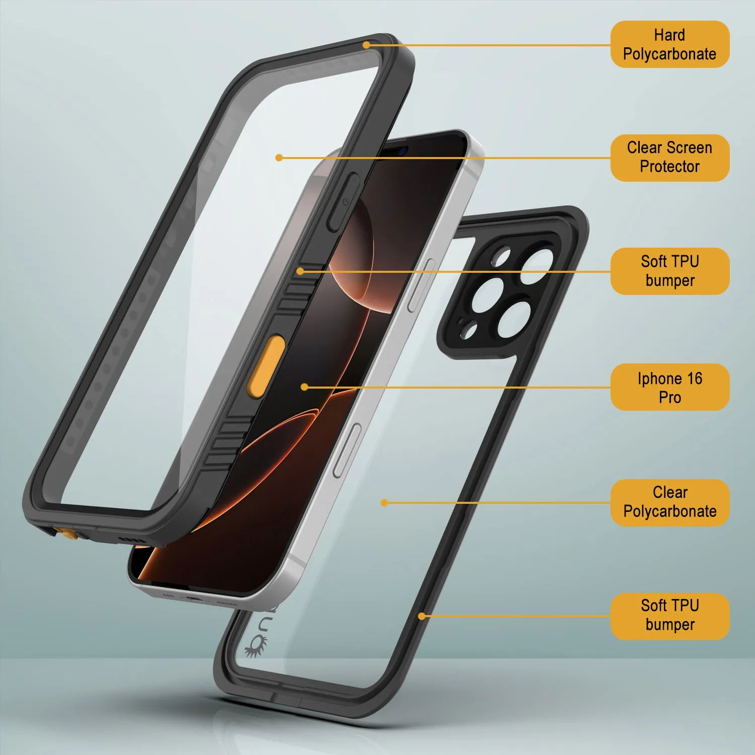 Funda impermeable para iPhone 16 Pro, Punkcase [Serie Extreme] [Ajuste fino] [Certificación IP68] [A prueba de golpes] [A prueba de nieve] [A prueba de suciedad] Funda protectora con protector de pantalla incorporado para Apple iPhone 16 [NEGRO]