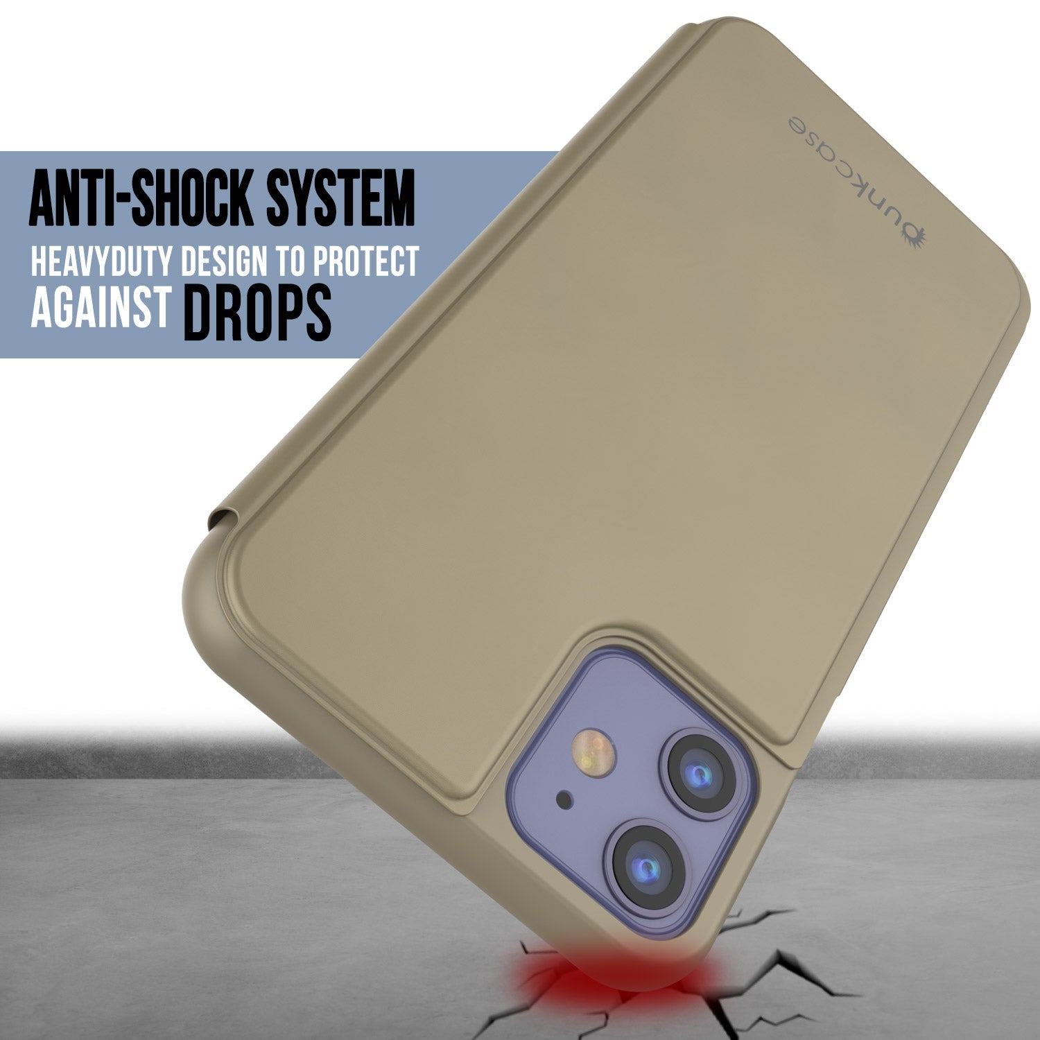 Funda Punkcase iPhone XI Reflector Case Protectora con Cubierta Abatible Resistente a los Arañazos, Espejo Translúcido Delantero y Trasera de Cuero PU Antideslizante Integrada con Soporte Compatible con Apple iPhone XI (Oro)