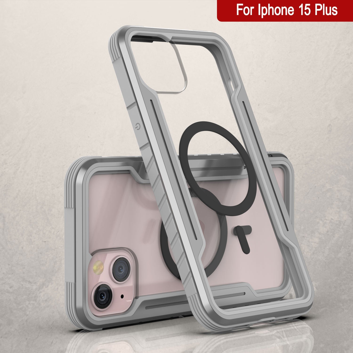 Punkcase iPhone 15 Plus [Serie Armor Stealth MAG Defense] Funda Ultra Delgada y Protectora de Grado Militar de Capas Múltiples con Marco de Aluminio [Parte trasera transparente] Protección definitiva contra caídas para tu iPhone 15 Plus (6.7") (2023) (Gris)