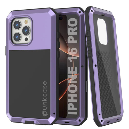 Funda de metal para iPhone 16 Pro, carcasa resistente de grado militar [a prueba de golpes], carcasa rígida de cuerpo completo [morado]