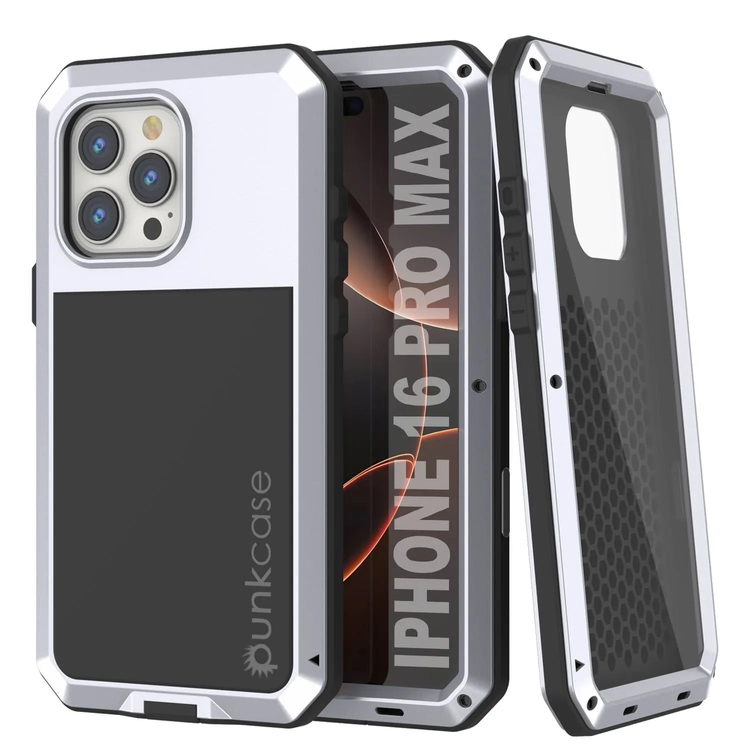 Funda de metal para iPhone 16 Pro Max, carcasa de armadura resistente de grado militar [a prueba de golpes], carcasa rígida de cuerpo completo [blanca]