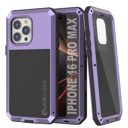 Funda de metal para iPhone 16 Pro Max, carcasa resistente de grado militar [a prueba de golpes], carcasa rígida de cuerpo completo [morado]