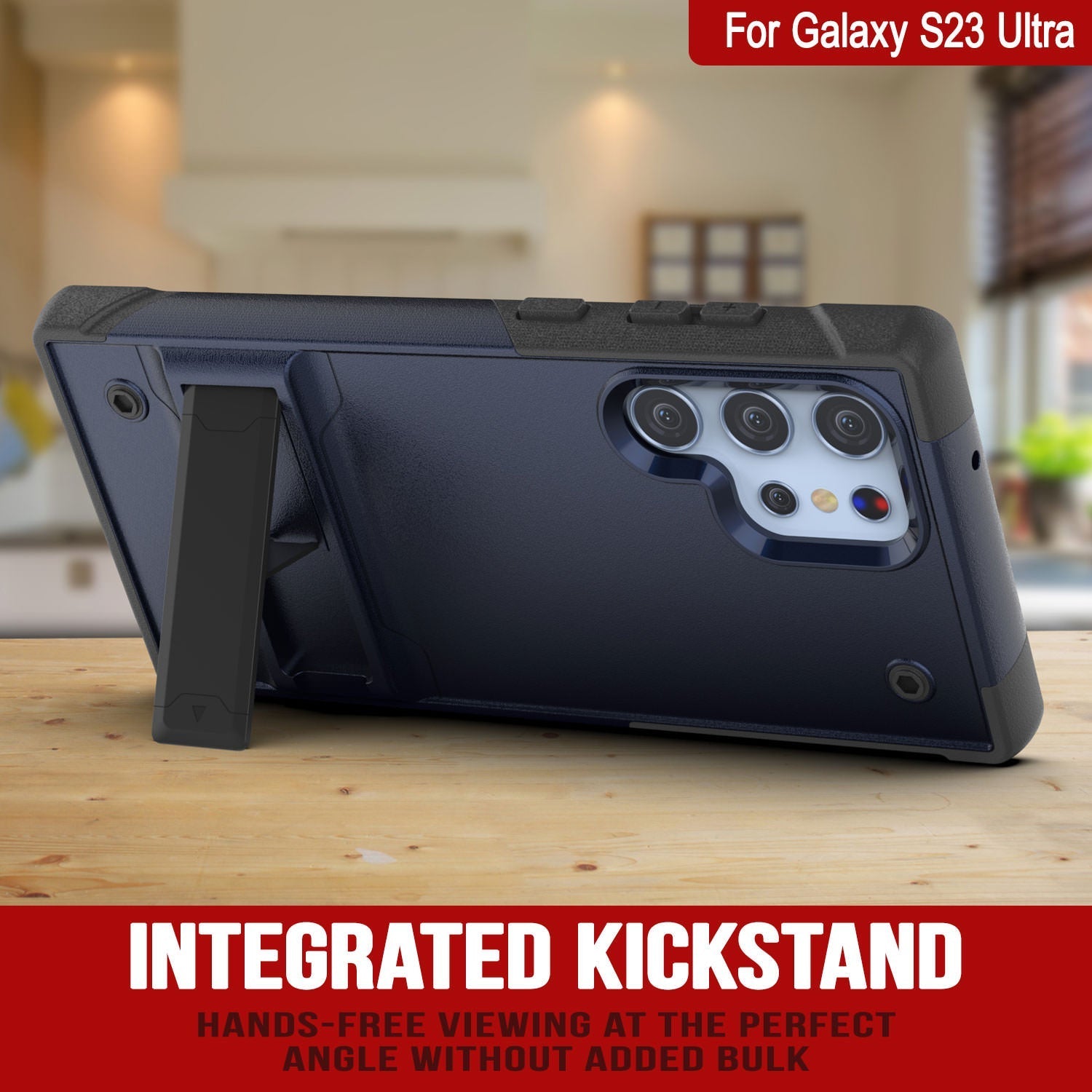 El estuche Punkcase Galaxy S23 Ultra [Serie Reliance] es un estuche híbrido protector con grado militar y soporte incorporado. Ofrece la máxima protección contra caídas para el Galaxy S23 Ultra de 6.8" (2023) en color azul marino y negro.